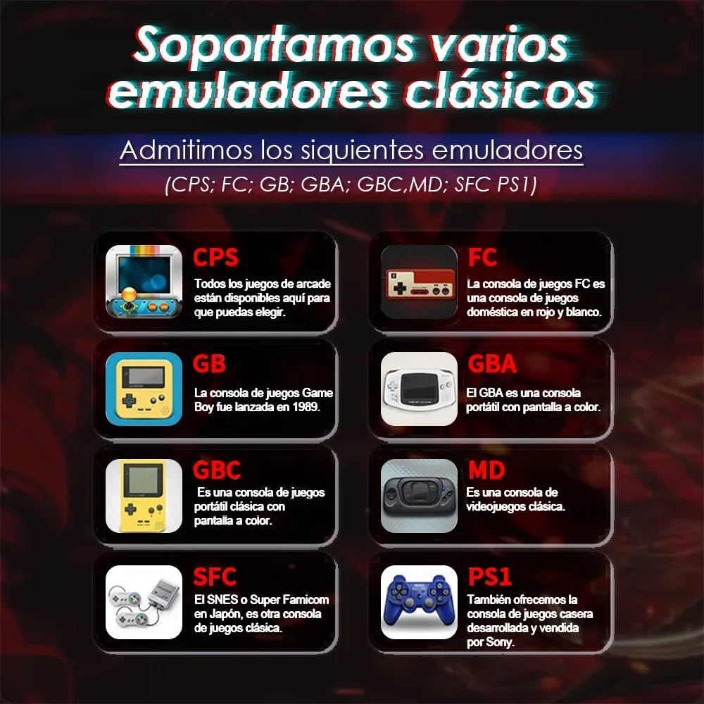 Desde los tiempos del Tekken 3, Metal Slug y Street Fighter, hasta joyas de PS1, GBA, NES, SNES y más. Esta consola te pone en bandeja la mayor colección retro en un solo dispositivo, con un diseño arcade que enamora a cualquier nostálgico.